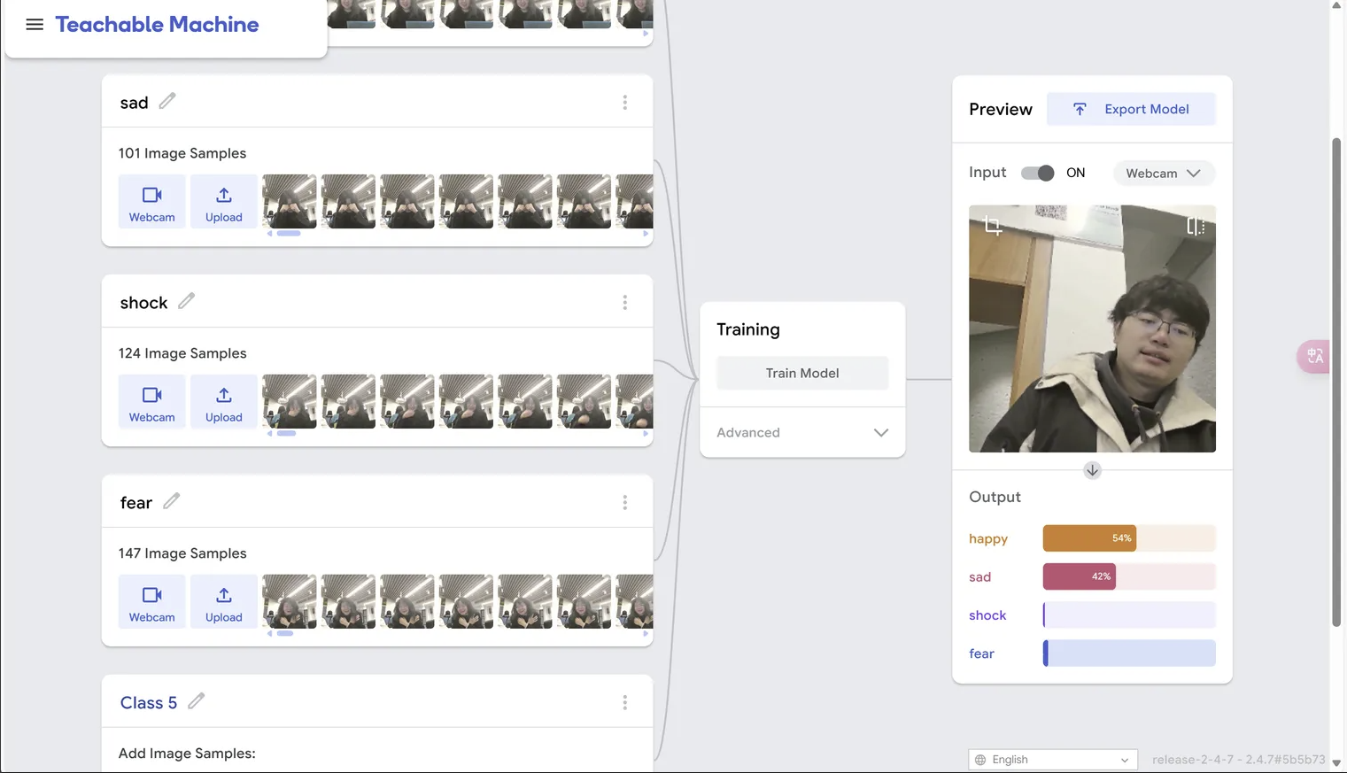 When working in a group, we first experienced Teachable Machine's image recognition training, we made three different facial expressions, took our portraits through the computer camera and uploaded them as the training dataset. What surprised me the most was the speed of training on this platform, in my past attempts this process often took me more than half an hour, however TM only took a few seconds. I was curious to see the author of this website's brief description of the technology used, which gave me my first insight into the concept of MobileNet as a built-in predefined model that simplifies the training process to a great extent, and that's why TM's training was so fast.